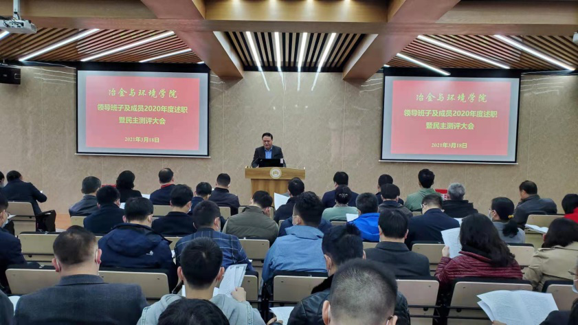 会议首先进行了公司领导班子及成员2020年度述职暨民主测评,成琼文书记代表院领导班子作现场述职,其他班子成员作书面述职。成琼文书记向大会作《凝心聚力,奋发有为,全力推动公司事业高质量发展》的主题报告。他指出,2020年是极不平凡的一年,公司领导班子带领全院师生员工团结一心、奋发有为,做好疫情防控、冶金馆搬迁与加固维修、金贵楼启用等具体工作,扎实推动各项中心工作,取得明显进步。一年来,公司领导班子始终坚持和加强党的全面领导,加强和改进党的建设,牢牢把握社会主义办学方向,积极统筹谋划、担当作为,在议事决策、公司“十四五”顶层设计、团队建设、人才培养、队伍建设、科学研究、国际化办学、条件保障和服务、疫情防控、群团工作等方面取得较好的工作业绩。报告还分析了公司发展存在的不足和问题,部署了今年的工作重点。成琼文书记强调过去的一年是辉煌的一年,在接下来的2021年,公司领导班子将团结带领全院师生以习近平新时代中国特色社会主义思想为指导,落实立德树人根本任务,推动公司事业发展实现新跨越,以优异成绩迎接建党100周年。